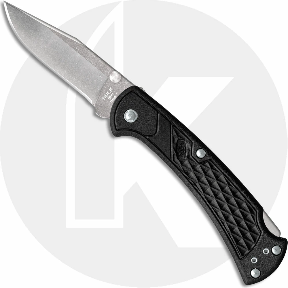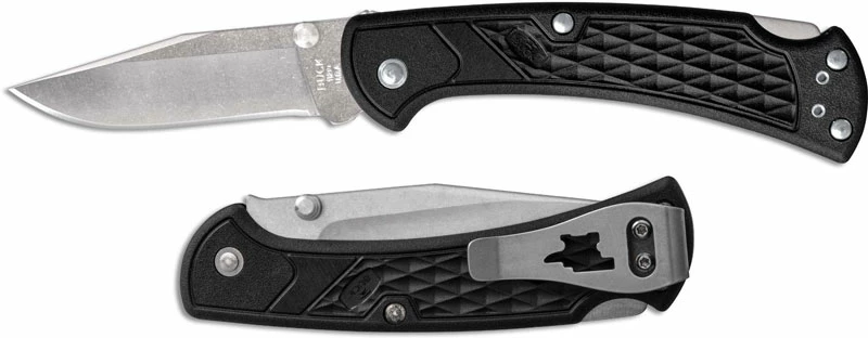 The 0112BKS1 Buck 112 Slim Select – a lightweight, value priced EDC version of the traditional Buck 112 Ranger folder, features a 3 inch clip point blade made of 420HC stainless steel, .120 inch thick, with dual thumb studs for ambidextrous one hand opening. The slim profile black GFN (glass filled nylon) handle, 4 1/4 inches closed, has checkered texturing for secure grip, a lockback and a side to side reversible deep carry pocket clip mounted at the butt end. The Buck 112 Slim Select has an overall open length of 7 1/4 inches, and it weighs only 2.5 ounces. Proudly made in the USA.