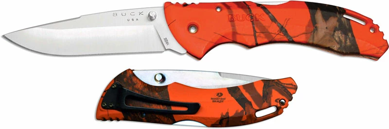 The illustrated Buck Knife is the Blaze Camo Buck Bantam BHW Knife that features a 3 5/8″ drop point blade made of 420HC stainless steel, .120″ thick, with dual thumb studs for ambidextrous one hand opening. The contoured, glass reinforced nylon handle of this Buck knife, 5 1/8″ closed, has a textured Mossy Oak Blaze camo finish, a finger groove and ridges for secure grip, a lockback and a lanyard hole. A black stainless steel pocket clip is mounted at the pivot end of this Buck knife. The Buck Bantam BHW Knife with Blaze Camo handle has an overall open length of 8 3/4″, and it weighs 3.2 ounces. Made in the USA.