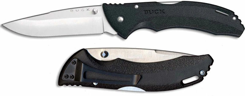 The illustrated Buck Knife is the Buck Bantam BHW Knife that features a 3 5/8″ drop point blade made of 420HC stainless steel with a thumb stud for one hand opening. The contoured black textured Thermoplastic handle of this Buck knife, 5 1/8″ closed, has a finger groove, grip ridges, a lockback and a lanyard hole. A black stainless steel pocket clip is included with this Buck knife. The Buck Bantam BHW Knife weighs 3.2 ounces.
