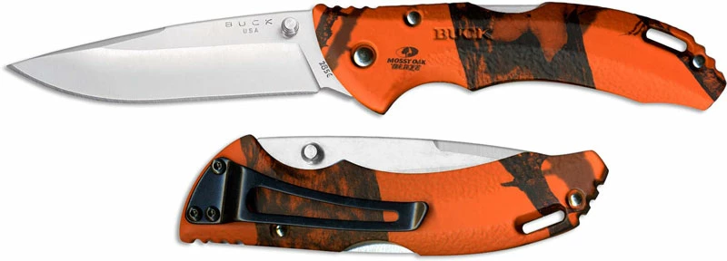The illustrated Buck Knife is the Blaze Camo Buck Bantam BLW Knife that features a 3 1/8″ drop point blade made of 420HC stainless steel, .120″ thick, with dual thumb studs for ambidextrous one hand opening. The contoured glass reinforced nylon handle of this Buck knife, 4 3/8″ closed, has a textured Mossy Oak Blaze camo finish, a finger groove and ridges for secure grip, a lockback and a lanyard hole. A removable stainless steel pocket clip is mounted at the pivot end of this Buck Knife. The Buck Bantam BLW Knife with Blaze Camo handle has an overall open length of 7 1/2″, and it weighs 2.4 ounces. Made in the USA.