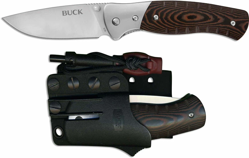 The illustrated Buck knife is the Buck Folding Selkirk Knife that features a 3 9/10″ drop point blade made of 420HC stainless steel, .150 inches thick, with a notched thumb rest and dual thumb studs for ambidextrous one hand opening. The brown and black Micarta handle, 5″ closed, has a steel bolster, CNC contouring for secure grip, steel liners for strength, and a liner lock. An injection molded sheath with horizontal carry option and a Ferrocerium Striker with emergency whistle are included with this Buck Knife. The Buck Folding Selkirk Knife has an overall open length of 8 9/10″, and it weighs 7.5 ounces. Made in China.