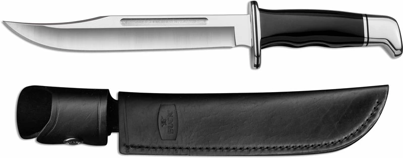 The illustrated Buck knife is the Buck General Knife that features a 7 3/8″ clip point fixed blade made of 420HC stainless steel, .175″ thick. The blade of this Buck Knife has a fuller. The black Phenolic handle has slight finger grooves, an aluminum cross guard and an aluminum pommel. A black genuine leather sheath is included with this Buck Knife. The Buck General Knife has an overall length of 12″, and it weighs 8.3 ounces. Made in the USA.