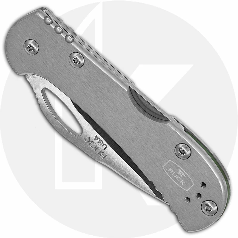 The 0726GYS Buck Mini SpitFire Knife is a compact value priced EDC that features a 2 3/4 inch drop point blade made of 420HC stainless steel, .098 inch thick, with a top swedge, a notched thumb rest for secure grip, and a hole for amdidextrous one hand opening. The slim profile gray anodized aluminum handle, 3 3/4 inches closed, has a contrasting colored back spacer, a lockback and a side to side reversible steel pocket clip mounted at the butt end. The Buck Mini SpitFire Knife has an overall open length of 6 1/2 inches, and it weighs 2.1 ounces. Made in the USA.