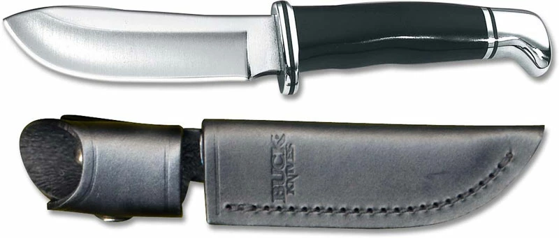 The illustrated Buck Knife is the Buck Skinner Knife that features a 4″ extra wide skinner blade made of 420HC stainless steel. The contoured black Phenolic handle of this Buck knife has an aluminum guard and butt. A black leather belt sheath is included with this Buck knife. The Buck Skinner Knife has an overall length of 8 1/4″, and weighs 4.3 ounces.