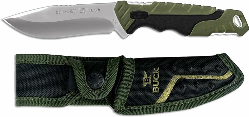 The 0658GRS Buck Pursuit Knife is a value priced hunter that features a 3 3/4 inch drop point fixed blade made of 420HC stainless steel, .100 inch thick, with a Rockwell hardness of 58, and a notched thumb rest for secure purchase and precise control. The Pursuit has full tang construction for strength; black GFN (glass filled nylon) handle with grooved green Versaflex® overlay, finger groove contouring for comfort and secure grip, and a lanyard hole. A black polyester sheath with green trim is included. The Small Buck Pursuit Fixed Blade Knife has an overall length of 8 inches, and it weighs 3.4 ounces. Proudly made in the USA.