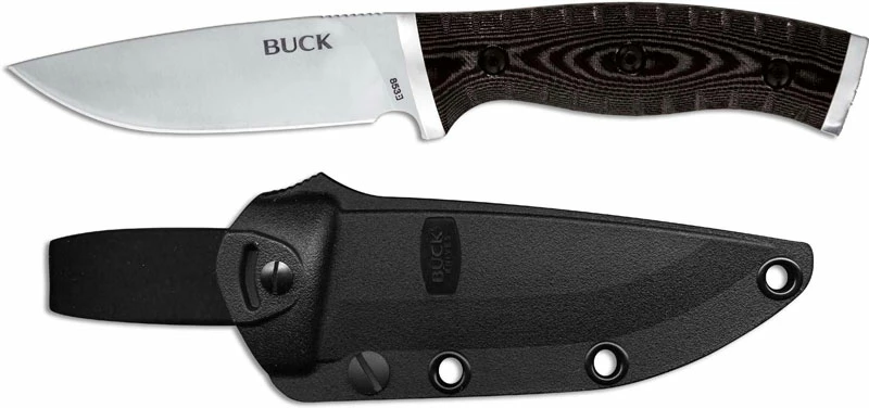 The 0853BRS Buck Small Selkirk – a compact EDC knife, features a 4 inch drop point fixed blade made of 420HC stainless steel, .125 inch thick, with a satin finish and a notched rest for secure grip. The Small Selkirk has full tang construction for strength, brown and black layered Micarta scales with a slight palm swell and milled grooves for secure purchase, a steel bolster and a steel pommel that is suitable for use as a light hammer. A molded polypropylene sheath with reversible belt loop is included. The Small Selkirk Knife has an overall length of 8 1/4 inches, and it weighs 6.4 ounces. Made in China.