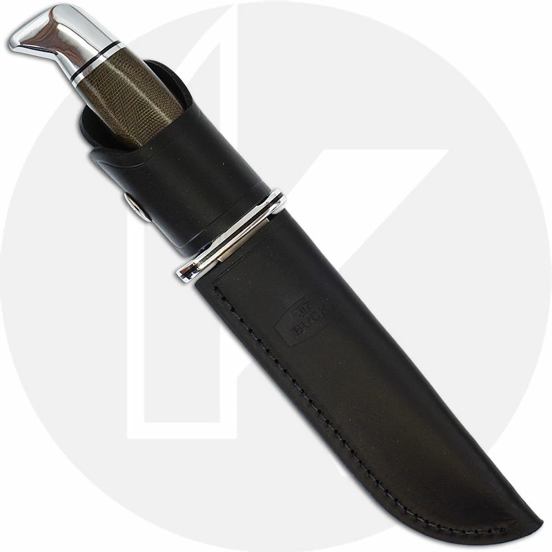 A new take on an old classic, the 0119GRS1 Buck Special Pro features a 6 inch clip point fixed blade made of premium S35VN stainless steel, .175 inch thick, with a satin finish and a fuller. The Special Pro has full length tang construction and an ergonomic green canvas micarta handle with polished aluminum guard and pommel. A black leather belt sheath is included. The Buck Special Pro has an overall length of 10 1/2 inches, and it weighs 7.7 ounces. Proudly made in the USA (sheath made in Mexico).