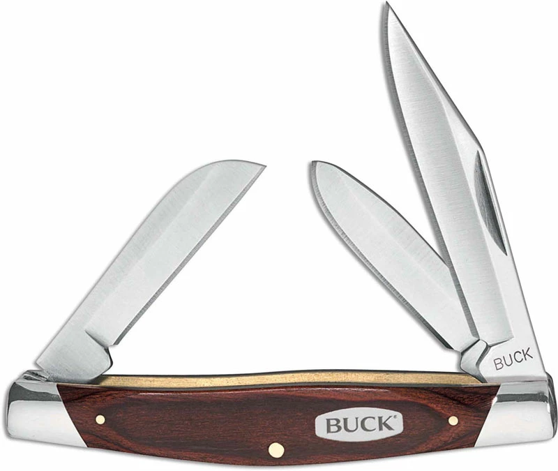 The illustrated Buck Knife is the Buck Stockman Knife with Woodgrain handle. The Buck Stockman Knife features clip, sheepfoot, and pen blades made of 420HC stainless steel. The blades of this Buck knife have short pull nail nick opening. The woodgrain handle of this Buck knife, 3 7/8″ closed, has brass liners, Buck logo shield inlay, and nickel silver bolsters. The Buck Stockman Knife weighs 3.1 ounces.