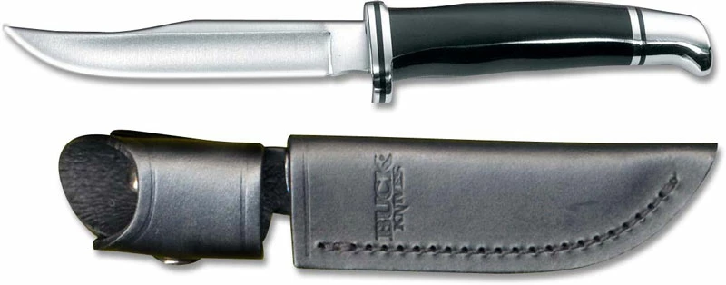 The illustrated Buck Knife is the Buck Woodsman Knife that features a 4″ clip point blade made of 420HC stainless steel. The contoured black Phenolic handle of this Buck knife has an aluminum guard and butt. A black leather belt sheath is included with this Buck knife. The Buck Woodsman Knife has an overall length of 7 3/4″, and weighs 2.5 ounces.