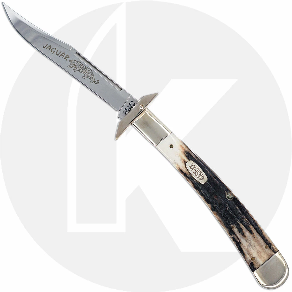 The 02277 Case Red Stag (R5151 SG) Jaguar features a clip blade made of mirror polished Tru-Sharp Surgical steel, with Jaguar embellishment, a nail nick for opening and a rotating swing guard. The genuine Red Stag handle, 5 5/16 inches closed, has the CASE XX Shield and nickel silver bolsters. The Case Jaguar Knife weighs 4.5 ounces. Discontinued item, BNIB; made in the USA in 1998.