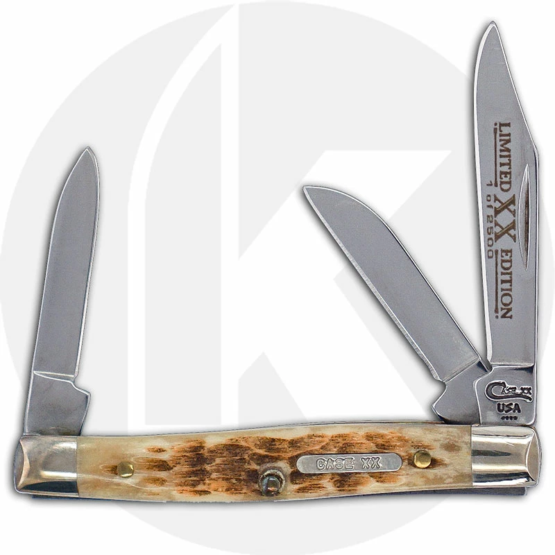 The 03971 Case Limited Edition III (6333SS) Small Stockman Knife features a clip blade with Limited XX Edition embellishment, sheepfoot and pen blades made of mirror polished Tru-Sharp Surgical steel, with nail nicks for opening. The Rogers Jig Butternut Bone handle, 2 5/8 inches closed, has a Case XX Bar Shield and nickel silver bolsters. The Case Small Stockman Knife weighs 1.2 ounces. Discontinued item, limited to 2500 pieces, BNIB; made in the USA.