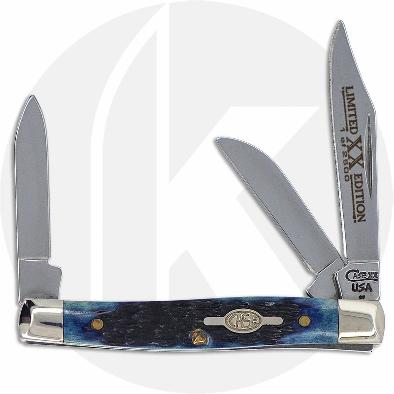 The 05971 Case Limited Edition V (6333SS) Small Stockman Knife features a clip blade with Limited XX Edition 1 of 2500 embellishment, sheepfoot and pen blades made of mirror polished Tru-Sharp Surgical steel, with nail nicks for opening. The jigged Navy Blue Bone handle, 2 5/8 inches closed, has the Case Saturn Shield and nickel silver bolsters. The Case Small Stockman Knife weighs .9 ounce. Discontinued item, BNIB; made in the USA in 1998.