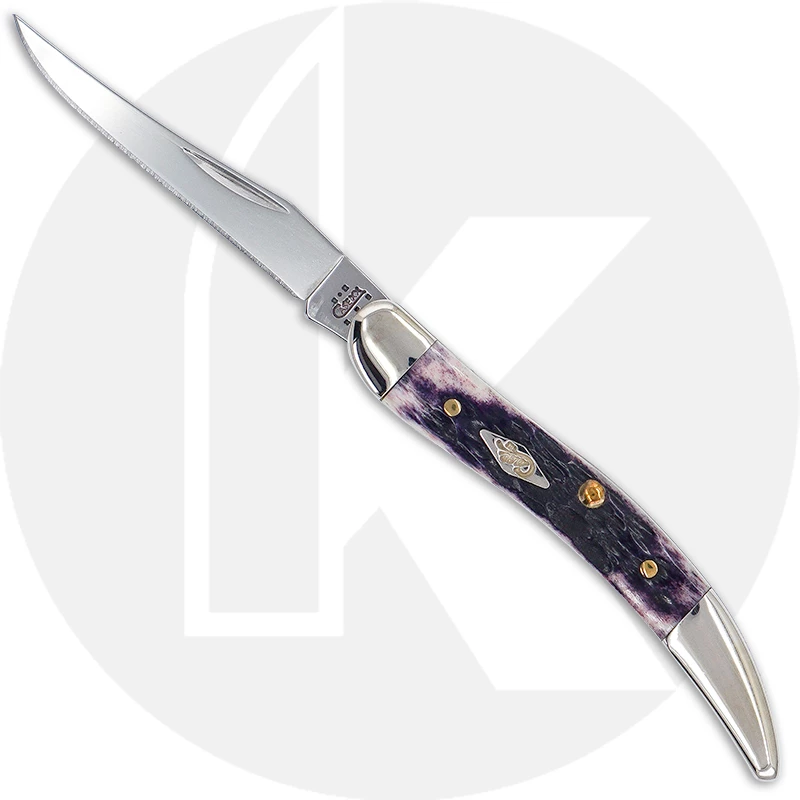 The 07039 Case Tradewinds Collection (610096 SS) Small Texas Toothpick Knife features a long clip blade made of mirror polished Tru-Sharp Surgical steel with a nail nick for opening. The Standard Jig Island Purple Bone handle, 3 inches closed, has the Case Diamond Shield and nickel silver bolsters. The Case Small Texas Toothpick Knife weighs 1.0 ounce. Discontinued item, BNIB; limited run of 500 pieces, made in the USA in 2004.