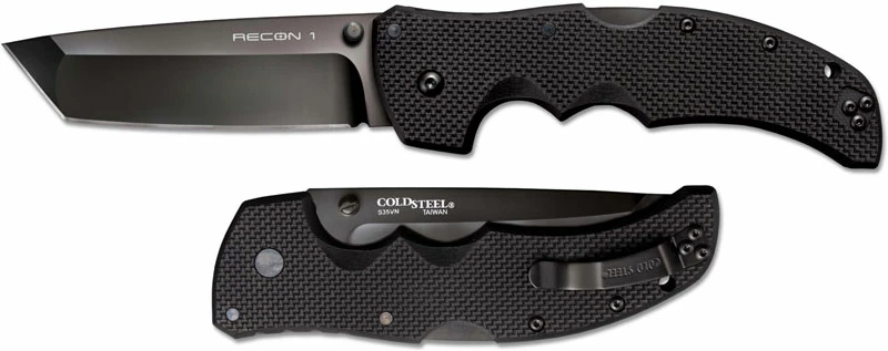 The Cold Steel Recon 1 with CPM S35VN blade steel! The 27BT Recon 1 Knife features a 4 inch tanto blade made of premium CPM S35VN stainless steel, 3.5mm thick, with a non reflective black DLC (Diamond Like Coat) finish, and dual thumb studs for ambidextrous one hand opening. The slim profile textured black G10 handle, 5 3/8 inches closed, has finger grooves for secure grip, sturdy Tri-Ad Lock, a lanyard hole, and ambidextrous pocket clip mounted at the butt end. The Recon 1 Knife with CPM S35VN steel blade has an overall open length of 9 3/8 inches, and it weighs 5.3 ounces. Made in Taiwan.