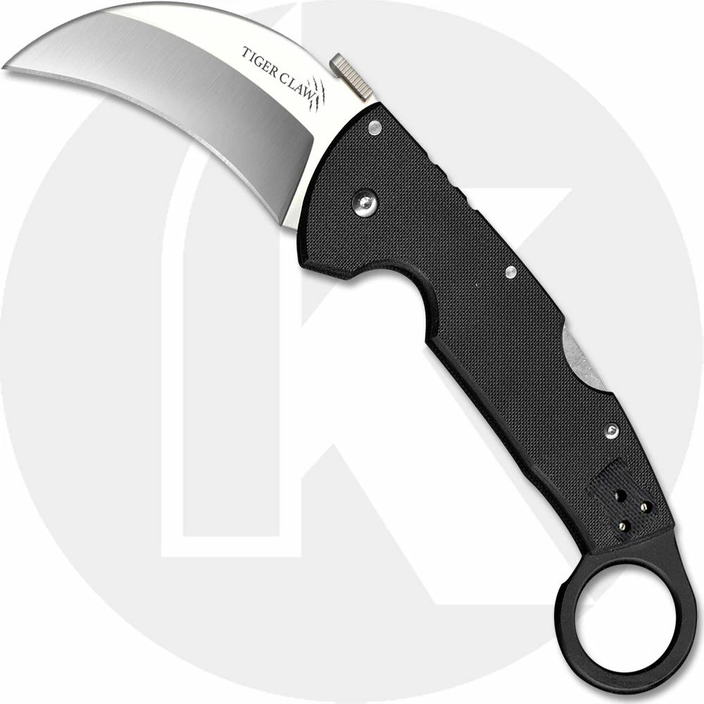 The22C Cold Steel Tiger Claw Knife, designed by Andrew Demko, features a 3.5 inch hawkbill blade made of premium S35VN stainless steel, 3.5mm thick, with a satin finish and a thumb plate for ambidextrous one hand opening and for opening on withdrawal. The textured black G10 handle, 6 inches closed, has a notched thumb rest and aluminum ring pommel for secure grip, sturdy Tri-Ad lock, and a removable stainless steel pocket clip mounted at the butt end. The Cold Steel Tiger Claw Knife has an overall open length of 9 inches, and it weighs 5.1 ounces. Made in Taiwan.