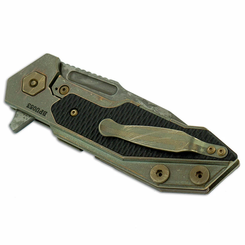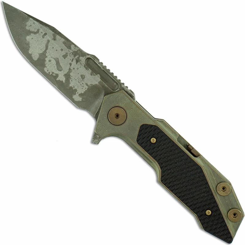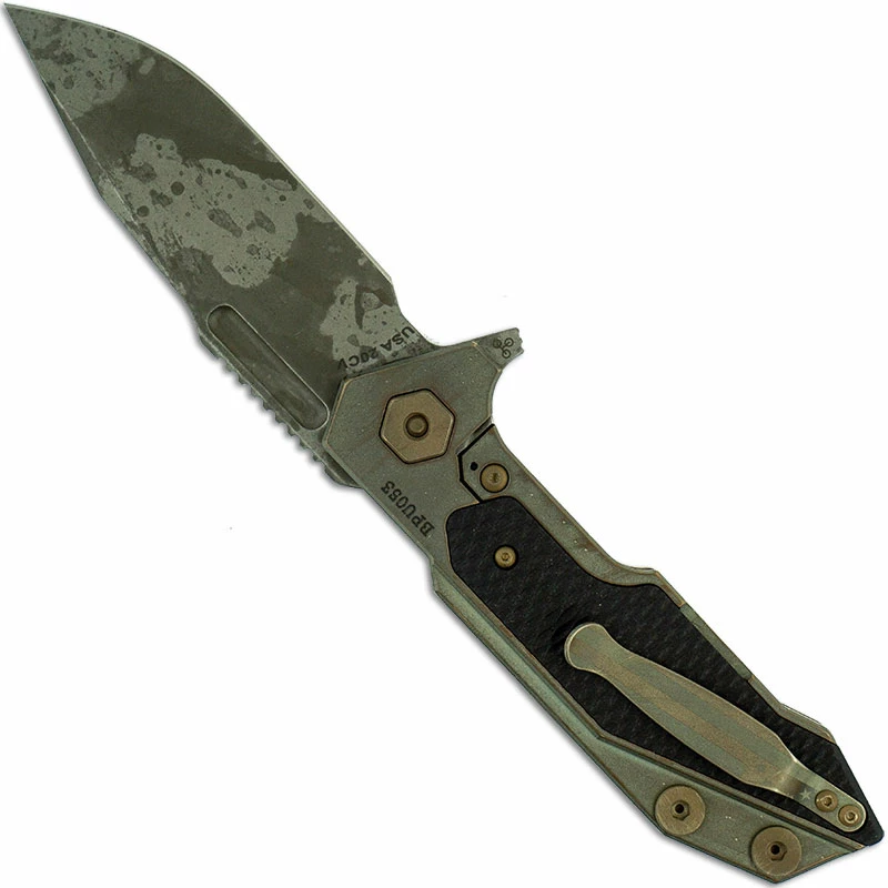 The Hinderer Full Track is the brawny big brother of the popular Half Track, designed by Rick Hinderer and manufactured by Hinderer Knives. This Full Track is a Limited Edition that features a 3.75 inch spearpoint blade made of CPM 20CV stainless steel, .165 inch thick, with a Battle Field Pickup finish, a short fuller, notched thumb rest for secure grip, and a flipper for ambidextrous one hand opening. The Battle Field Pickup titanium handle, 5.125 inches closed, has textured black G10 inlays for secure purchase, sturdy frame lock with Hinderer Lockbar Stabilizer, handy modular backspacer tool for maintenance, and a removable pocket clip mounted at the butt end. The Limited Edition Hinderer Full Track Knife has an overall open length of 8.875 inches, and it weighs 6.8 ounces. Serial numbered, proudly made in the USA.
