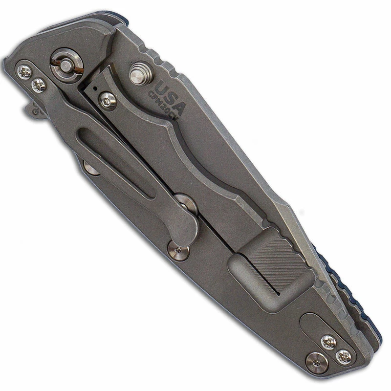 This Hinderer Eklipse Folder, designed by Rick Hinderer and manufactured by Hinderer Knives, features a 3.5 inch harpoon spanto blade made of CPM 20CV stainless steel, .165 inch thick, with the Hinderer Working Finish. The blade has a notched thumb rest for secure purchase, a press fit 1/4 inch diameter ambidextrous thumb stud (that locks up against the frame for superior strength against sideways torque) and a flipper for one hand opening. The ergonomic handle, 4.75 inches closed, has the innovative Tri-Way Pivot System that enables the end user to switch between nylon teflon, phosphorus bronze and ball bearing pivot as needed or preferred. This Eklipse has a non lock side titanium liner with a textured blue / black G10 scale for secure grip, a Working Finish CNC machined 6AL4V titanium back with frame lock and Hinderer Lockbar Stabilizer, open frame construction with large standoffs for strength and ease of cleaning, and an end to end reversible pocket clip. The Hinderer Eklipse 3.5 Folder has an overall open length of 8.25 inches, and it weighs 5.6 ounces. Proudly made in the USA.