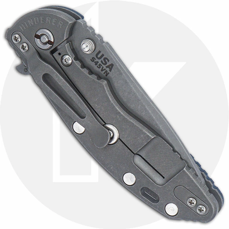 This Hinderer XM-18 3.5 Inch features a 3.5 inch Spanto blade made of premium S45VN stainless steel, .165 inch thick, with a Working Finish, a notched thumb rest for secure purchase, a press fit ambidextrous thumb stud that locks up against the frame for superior strength against sideways torque, and a flipper for fast opening. The ergonomic handle, 4.75 inches closed, has the innovative Tri-Way Pivot System that enables the end user to switch between nylon teflon, phosphorus bronze and ball bearing pivot as needed or preferred. This XM-18 3.5 has a non lock side with titanium liner and textured blue / black G10 scale for secure grip, CNC machined 6AL4V titanium back with Working Finish, sturdy frame lock and Hinderer Lockbar Stabilizer, open frame construction with large standoffs for strength and ease of cleaning, a lanyard hole and an end to end reversible pocket clip. The Hinderer XM-18 3.5 Inch Spanto has an overall open length of 8.25 inches, and it weighs 5.4 ounces. Proudly made in the USA.