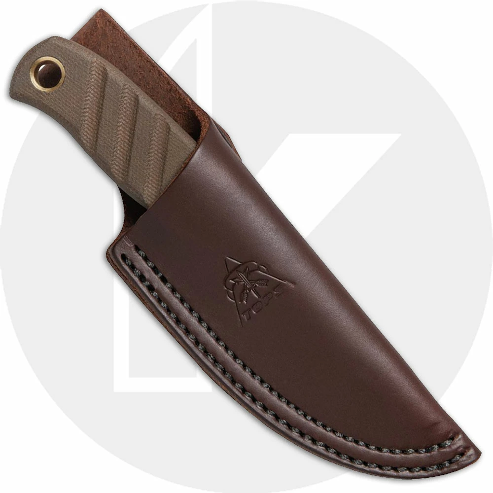The BAJA-03 TOPS Baja 3.0 Knife is a scaled down version of the Baja 4.5 field / camp knife that features a 3 inch drop point fixed blade made of 1095 steel, .130 inch thick, with a Rockwell hardness of 56-58. The blade has a full flat grind, Coyote Tan finish, and notched thumb rest and finger guard for secure grip. The Baja 3.0 Knife has full tang construction for strength; ergonomic green canvas Micarta scales with milled grooves for secure purchase, and a lined lanyard hole. A genuine leather belt loop sheath is included. The TOPS Knives Baja 3.0 Knife has an overall length of 6.25 inches, and it weighs 3 ounces; 5.1 ounces with the sheath. Made in the USA.