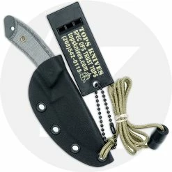 The BWLF-02 TOPS Brush Wolf Knife is a versatile outdoor tool, designed by Aaron and Nate Morgan, that features a 6.50 inch Nessmuk style fixed blade made of 1095 steel, .190 inch thick, with a Rockwell hardness of 56-58. The blade has a 6.25 inch cutting edge, a Tungsten Cerakote finish, a sawback, and a notched thumb rest for secure grip. The Brush Wolf Knife has full tang construction for strength; ergonomic green canvas Micarta scales with integral bow drill divot and a lined lanyard hole. A brown leather sheath with dangler is included. The TOPS Knives Brush Wolf Knife has an overall length of 12.13 inches, and it weighs 11.7 ounces, 17.7 ounces with the sheath. Made in the USA.