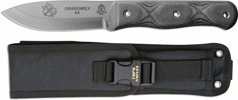The DFLY-4.5 TOPS D Fly 4.5 Knife is a no nonsense lightweight bushcraft knife, designed by Caleb Musgrave, that features a 4.5 inch classic Hunters Point fixed blade made of 1095 steel, .130 inch thick, with a Rockwell hardness of 56-58, and Bead Blast flats. The Dragonfly Knife has full tang construction for strength; ergonomic black canvas Micarta scales and a lined lanyard hole. A black ballistic nylon sheath with MOLLE backing is included. The TOPS Knives D Fly 4.5 Knife has an overall length of 9.75 inches, and it weighs 7.25 ounces. Made in the USA.