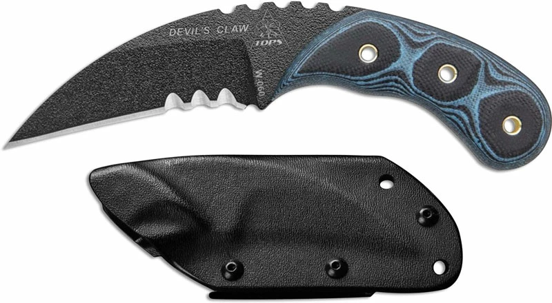 TOPS Knives: TOPS Devil’s Claw Knife, Black Part Serrated with Blue and Black G10, TK-DEVCL01