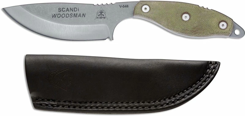 TOPS Knives: TOPS Scandi Woodsman Knife, Tumble Finished 1095 with Green Canvas Micarta, TK-SWOOD35
